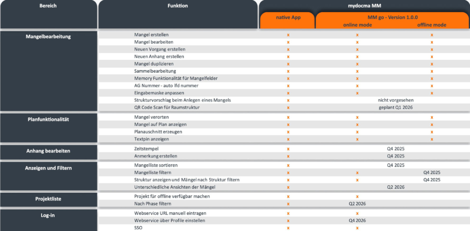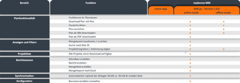 In Version 1 liegt der Fokus auf einer stabilen Basis. Der aktuelle Funktionsumfang im Online- und Offlinemodus sowie ein Ausblick auf die Umsetzung kommender Funktionen sind in der nachfolgenden Übersicht dargestellt.